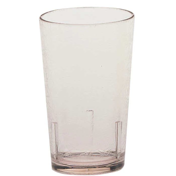 Cambro® D8152 Clear Crackle tumblers feature the look and feel of glass, but offer the cost savings and lightweight handling of break resistant plastic. Del Mar tumblers weigh up to 50% less than glass, making it easier and safer for wait staff to carry and serve beverages. Cambro® tumblers feature stacking lugs for easy stacking, transport and storage and are dishwasher safe.