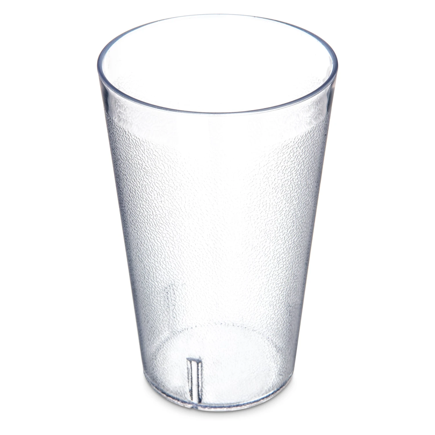 This 32 ounce clear tumbler has a pebbled textured that hides wear and tear. Stacking lugs prevent jamming when stored and the SAN material is break resistant to extend longevity.