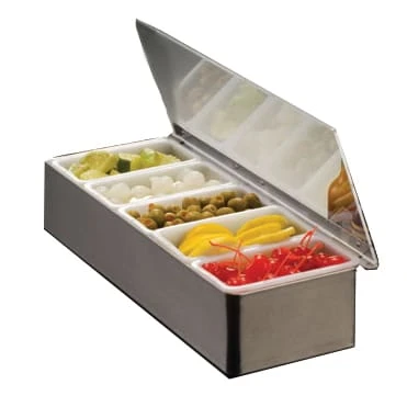Keep olives, lemons, and limes organized and close at hand with this 5-compartment stainless steel bar condiment dispenser. The hinged plastic lid helps seal in freshness.