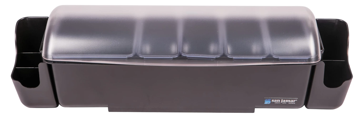 This San Jamar® The Dome® Garnish Center is tailored to fit on standard mixing rails and is ideal for bars. It includes one 2 Quart deep tray and four 1 Pint standard trays which can hold garnishes, condiments, toppings, and more. It also includes two snap-on caddies which can be used to hold straws, stirrers, and picks. A patented domed-lid allows for easy access. This center is completely dishwasher safe.