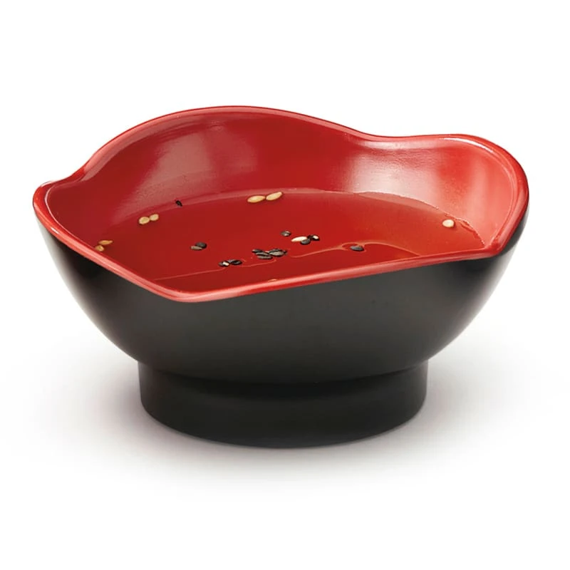 This Fuji sauce dish from G.E.T. has a 3 ounce capacity and the black exterior and red interior will add flare to any table setting! It is made of break‐resistant melamine and is commercial dishwasher safe and BPA free. Perfect for restaurants or banquet facilities.