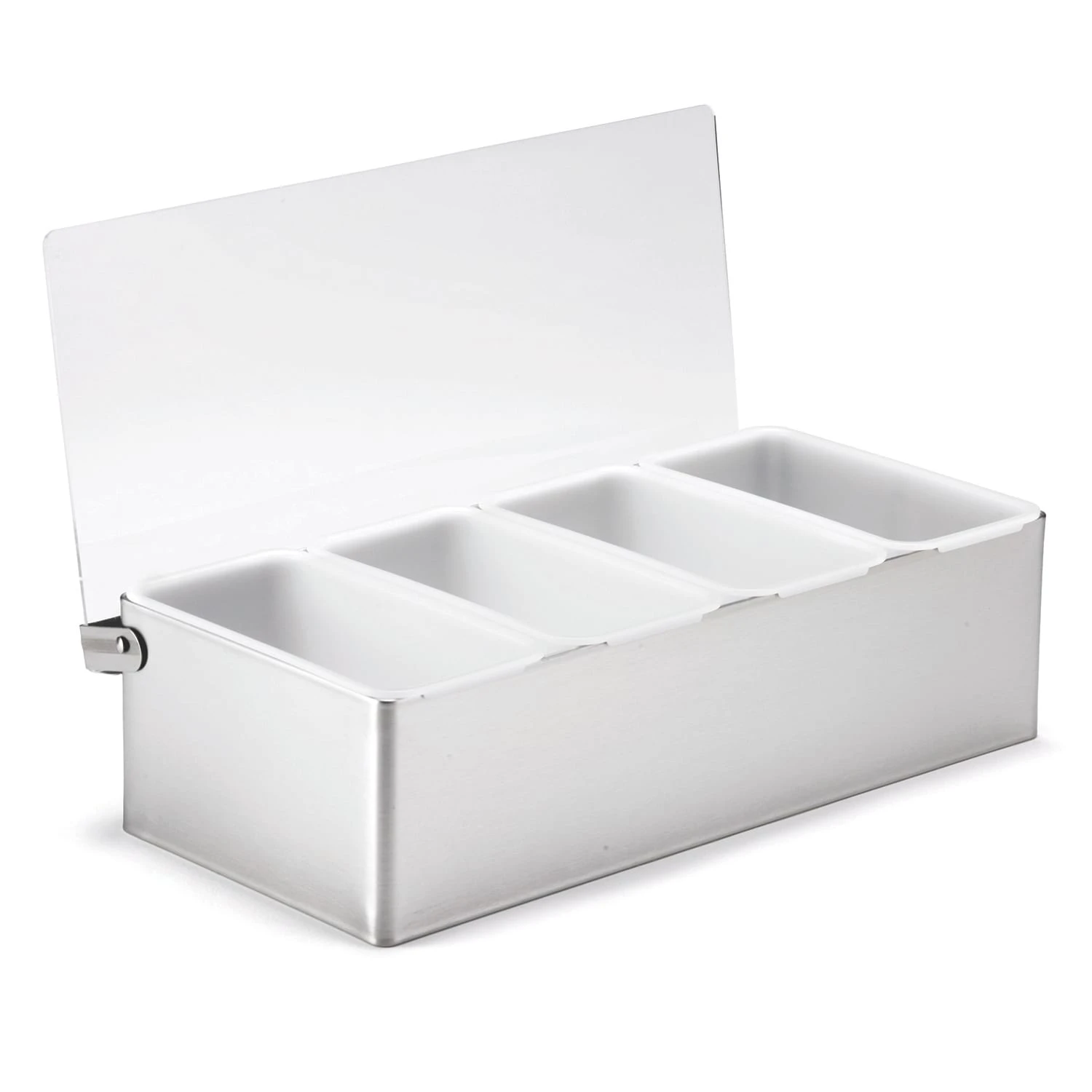 This condiment holder is constructed of heavy gauge stainless steel. It has a shatter proof polyethylene lid and four, one‐pint plastic inserts with lids. This container has no bottom, and the box is therefore not made to hold ice. Each compartment measures 5.63″ long by 2.875″ wide by 2.875″ high.